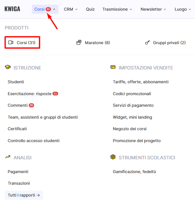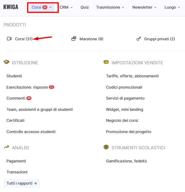 Vai alla sezione Corsi nel menu in alto e seleziona il prodotto Corsi.