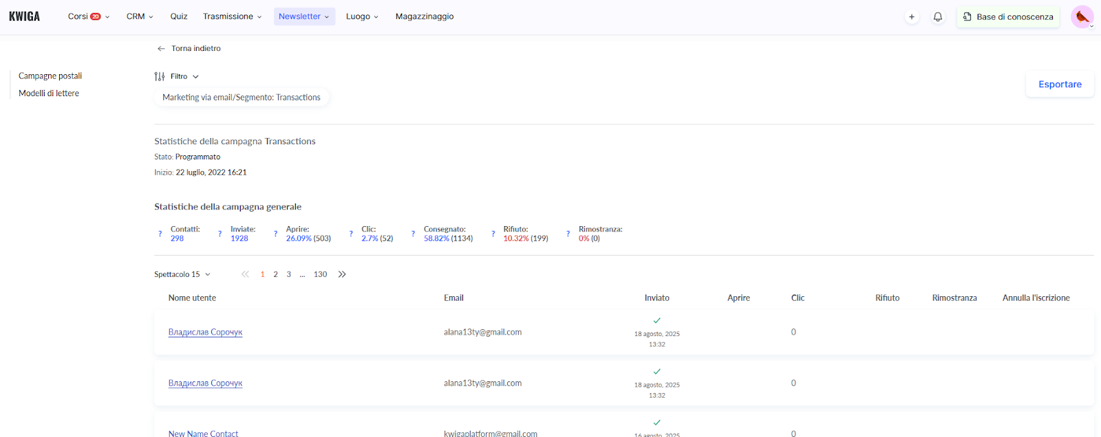 Sulla piattaforma Kwiga è possibile inviare diversi tipi di lettere: mailing list regolari, lettere tramite automazione e messaggi di sistema (attivazione, conferma di pagamento, notifica di verifica delle pratiche, ecc.). Tuttavia, a volte le lettere non arrivano ai destinatari.
