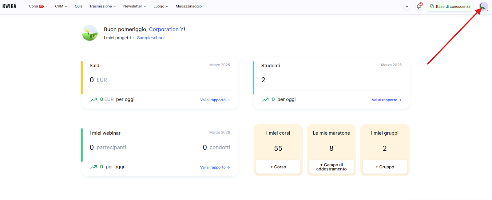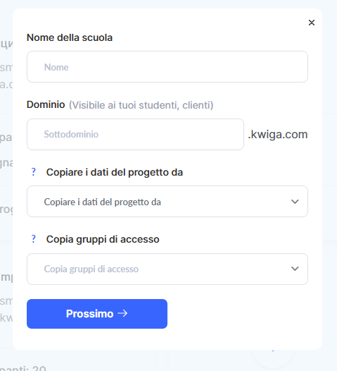 ● Dominio — un sottodominio nel formato nome.kwiga.com (questo è ciò che vedranno i tuoi studenti e clienti). Consigliamo di pensare al sottodominio in anticipo. Se lo cambi più tardi, il link precedente smetterà di funzionare. È meglio configurarlo subito o almeno prima di aggiungere studenti.