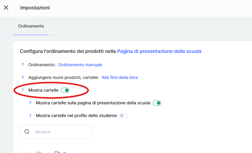 Potrai decidere se visualizzare le cartelle e se mostrarle nella pagina di presentazione della scuola utilizzando gli appositi interruttori (toggle).