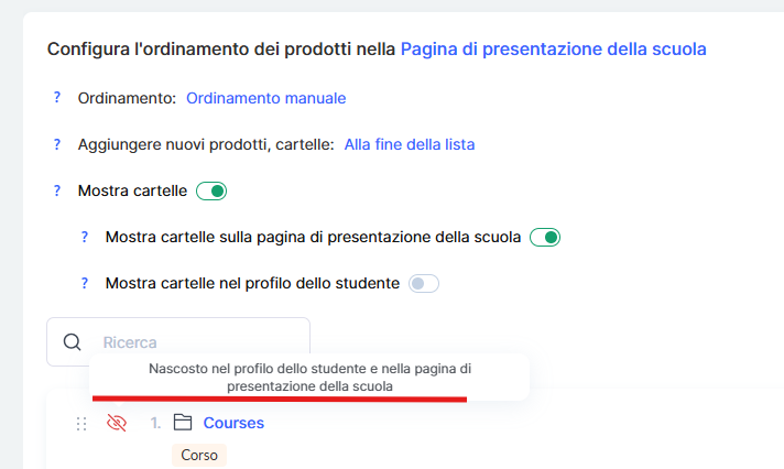 A seconda delle impostazioni selezionate, l’icona cambierà — questo ti aiuta a orientarti rapidamente, e passando il cursore sopra di essa apparirà un tooltip che indica quali cartelle sono visibili agli studenti e quali invece sono nascoste.
