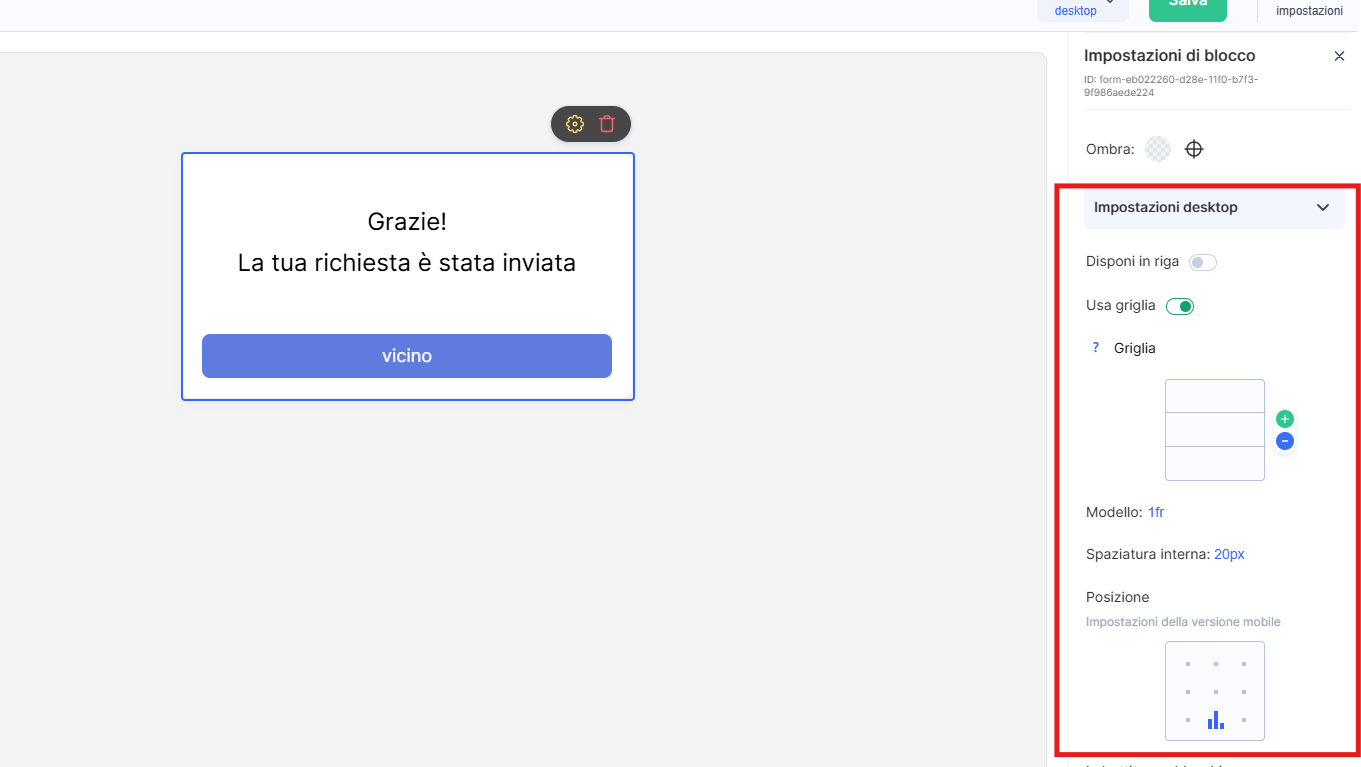 Impostazioni aggiuntive permettono di allineare il modulo nella versione mobile della pagina — a sinistra, al centro o a destra — in base al tuo design.