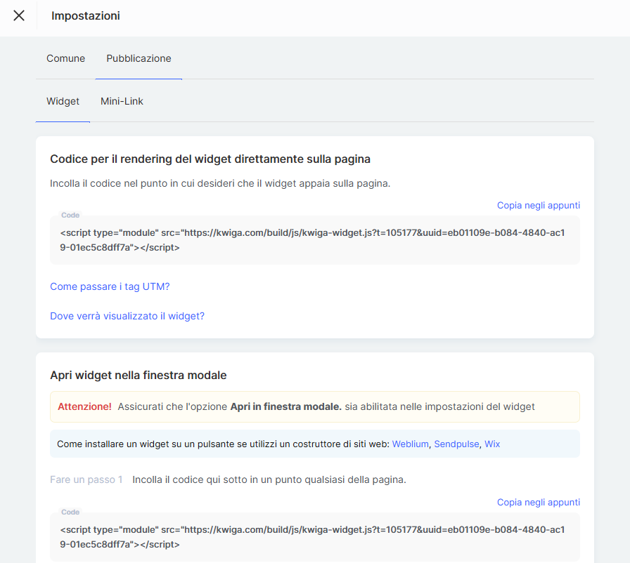 Nella scheda Pubblicazione, puoi copiare il codice del widget per incorporarlo direttamente nella tua pagina.
