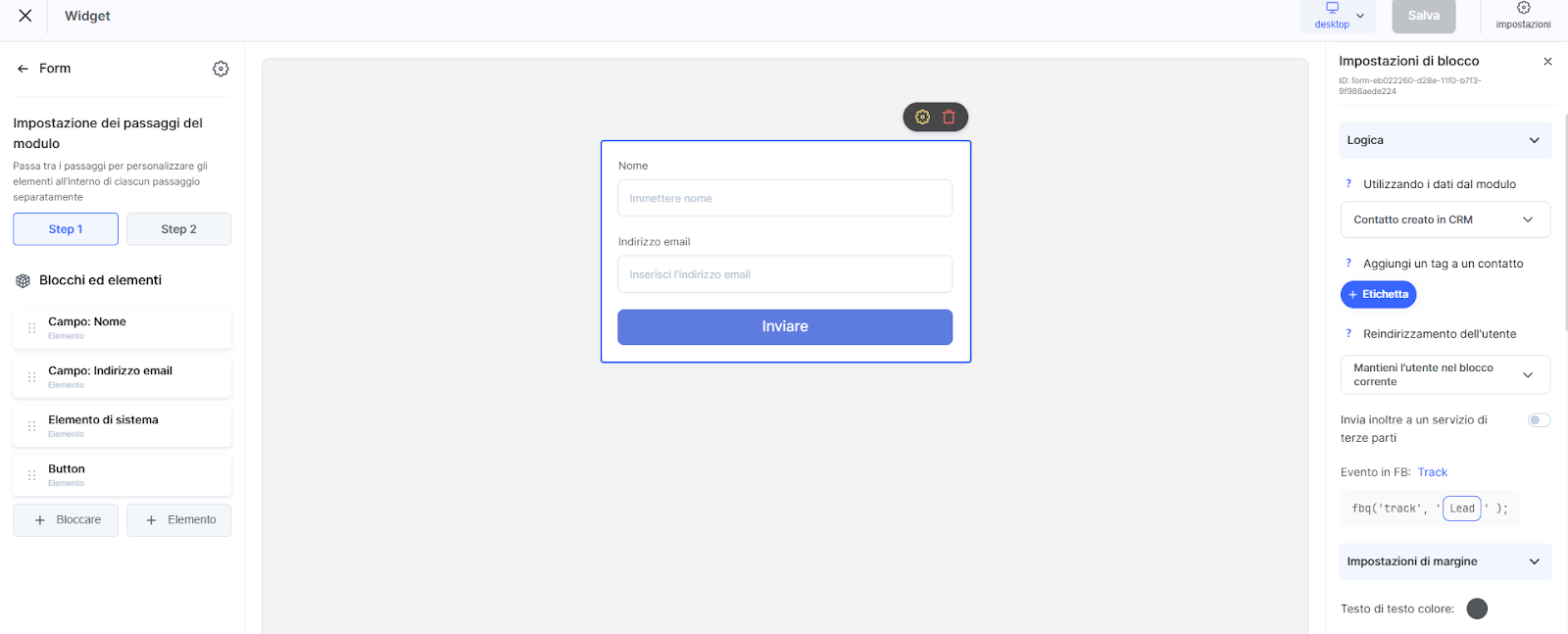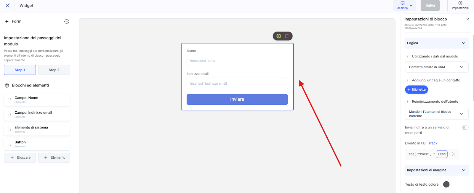 Nota: I campi aggiunti al modulo vengono salvati automaticamente nella scheda dell’utente nel CRM. Puoi usare sia i campi standard (nome, email) sia creare campi personalizzati.