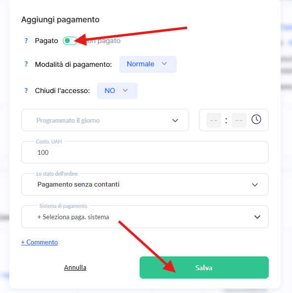 Nella finestra che si apre, contrassegna il pagamento come pagato (utilizzando l’interruttore) e salva le modifiche. Puoi lasciare un commento per te o per i tuoi colleghi; questo non sarà visibile allo studente.