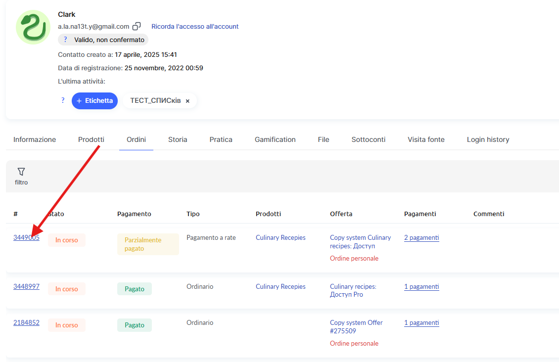 Per contrassegnare come pagato uno dei pagamenti effettuati tramite la piattaforma, vai su Contatti, trova il cliente (studente) interessato, apri la sua scheda contatto e vai alla scheda Ordini. Clicca sul numero dell’ordine.