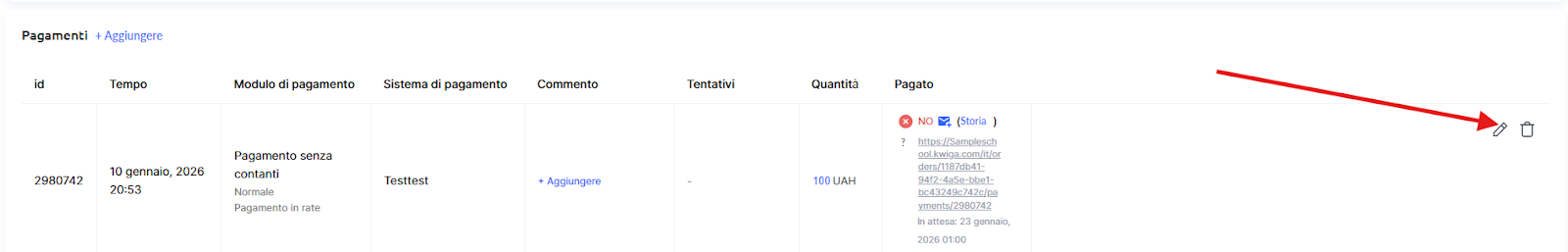 Scorri verso il basso nella pagina aperta fino alla sezione Pagamenti. Accanto ai pagamenti contrassegnati come non pagati, vedrai un’icona a forma di matita; clicca su di essa per modificare il pagamento.