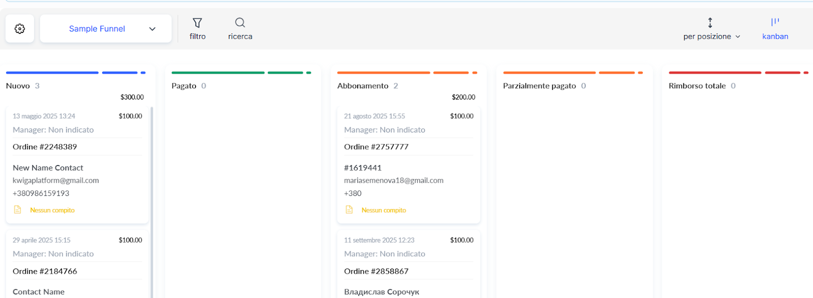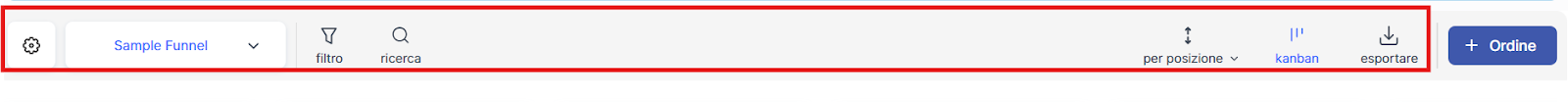 Qui, gli ordini vengono ordinati per stato all’interno del funnel corrispondente, che si presenta visivamente come una bacheca Kanban o una tabella.