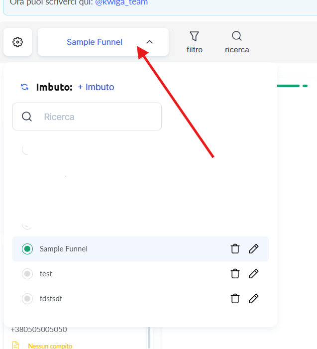 Per creare un nuovo funnel, apri CRM → Ordini e fai clic sul pulsante con il nome del funnel attuale (ad esempio, Il mio funnel). Nel menu che appare, fai clic su + Funnel.