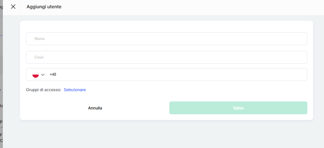 Quando aggiungi un utente, puoi selezionare un Gruppo di accesso, ad esempio uno con accesso completo, oppure creare un gruppo personalizzato con accesso parziale a sezioni specifiche del pannello di controllo. Puoi anche aggiungere un utente senza assegnargli un gruppo e configurare l’accesso in un secondo momento.