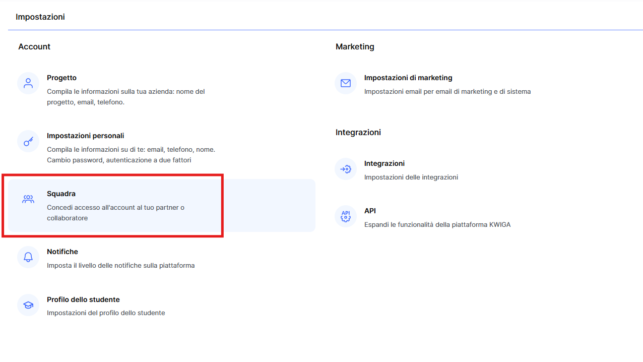 La gestione del team inizia con la corretta assegnazione dei ruoli e dei diritti di accesso. Sulla piattaforma Kwiga, puoi facilmente aggiungere nuovi membri del team, configurare le loro autorizzazioni e organizzare una collaborazione efficiente. In questo articolo scoprirai come farlo.