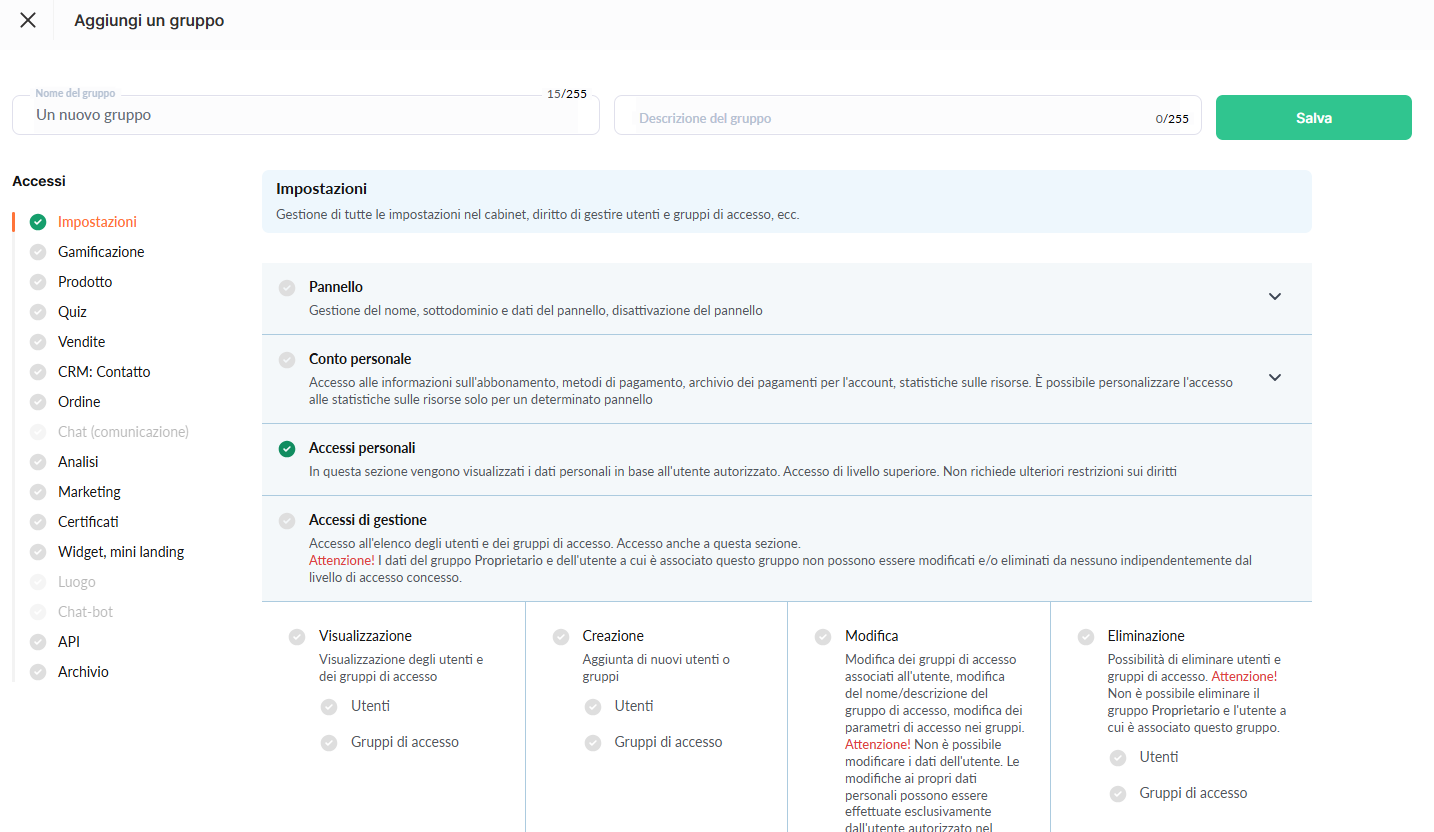 Fai clic su + (Aggiungi gruppo), assegna un nome (ad esempio “Amministratori”, “Supervisori” o “Manager”, ecc.) e utilizza le caselle di selezione per impostare il livello di accesso.