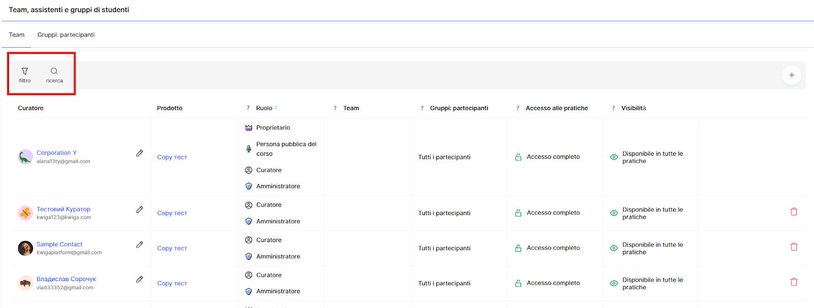 Vai al menu Corsi → Team, Assistenti e Gruppi di studenti. Apri la scheda Team.
