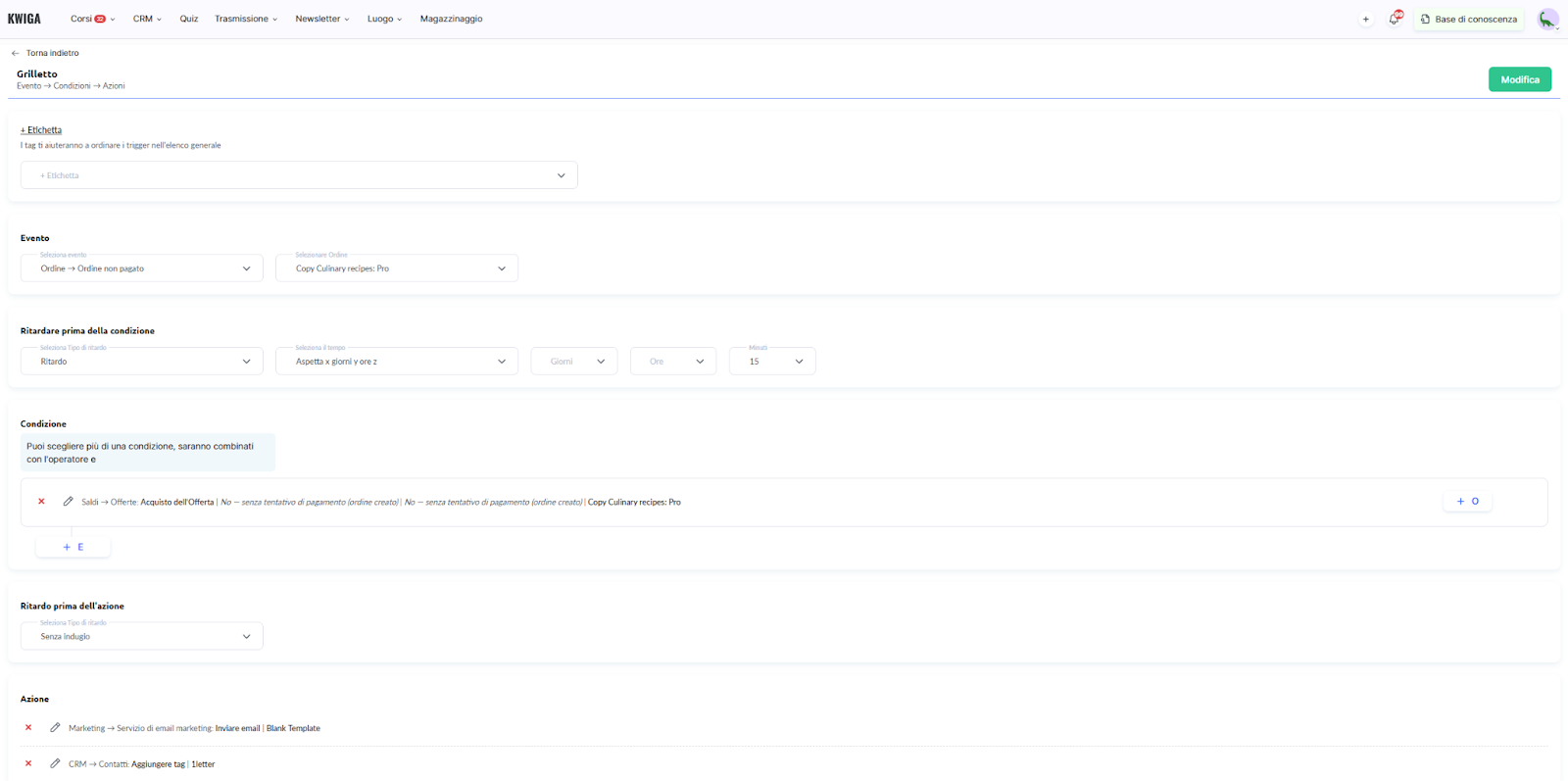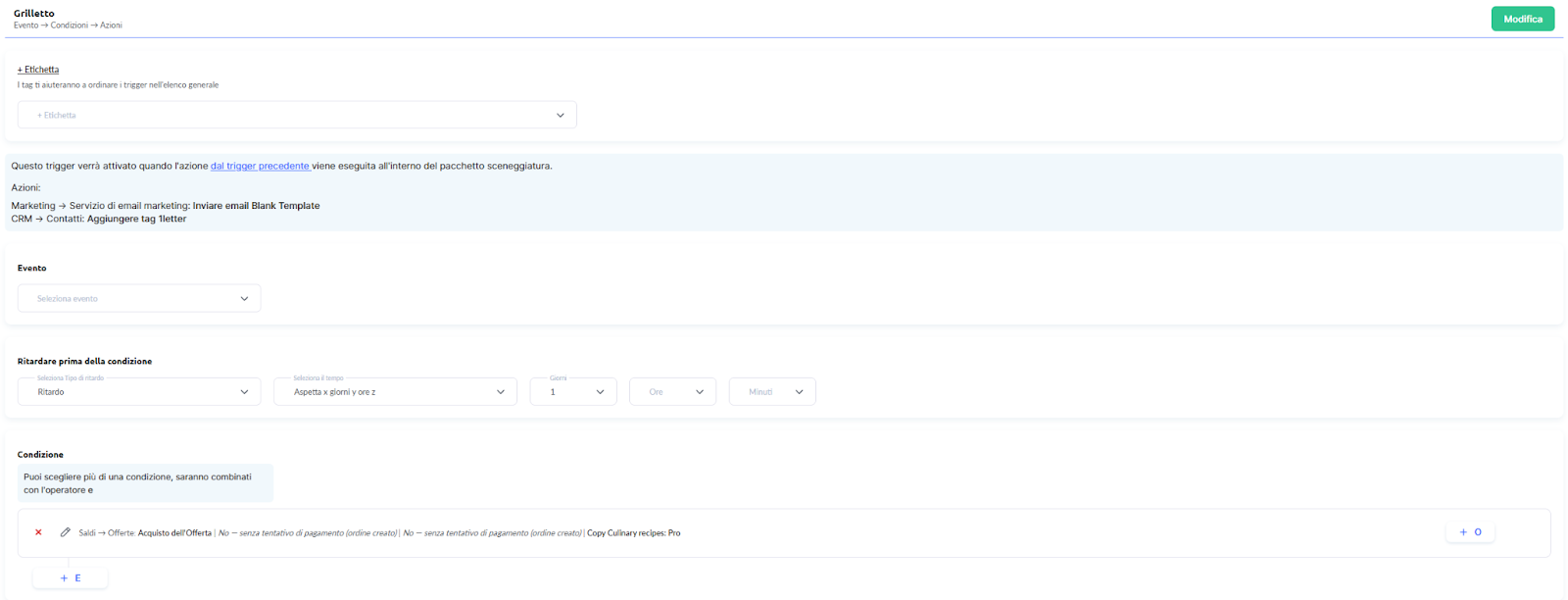 Successivamente, passa direttamente alle azioni: puoi aggiungere un tag per individuare facilmente i contatti che intendevano pagare ma non hanno completato il pagamento.