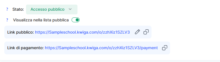 Accesso pubblico — gli studenti possono acquistare il corso tramite un link o dalla pagina del corso. Puoi scegliere se mostrare l’offerta pubblicamente o renderla accessibile solo tramite link diretto.