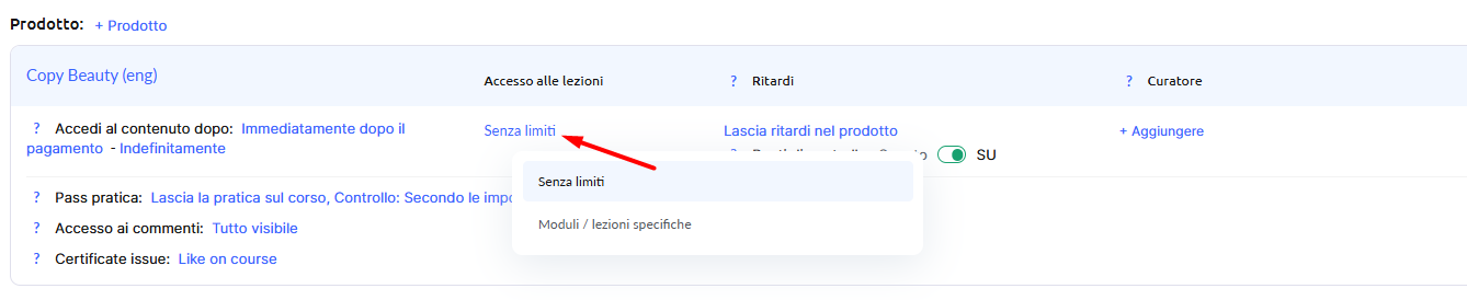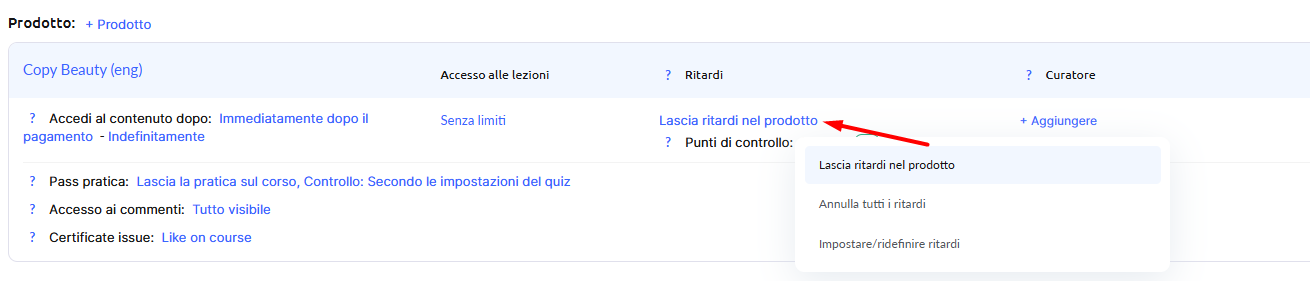 Calendario di apertura delle lezioni: se hai un calendario di pubblicazione delle lezioni, puoi configurarlo direttamente nel corso o nell’offerta. Per il primo lancio, si consiglia di farlo nel corso (nella sezione Date e ritardi di apertura delle lezioni), quindi non è necessario modificare nulla nei ritardi dell’offerta.