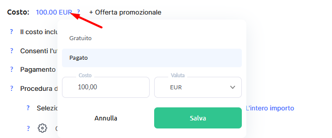 Seleziona l’opzione A pagamento e vedrai immediatamente impostazioni aggiuntive per indicare i prezzi e le valute. Qui puoi stabilire il prezzo massimo del corso; successivamente potrai aggiungere promozioni o sconti.