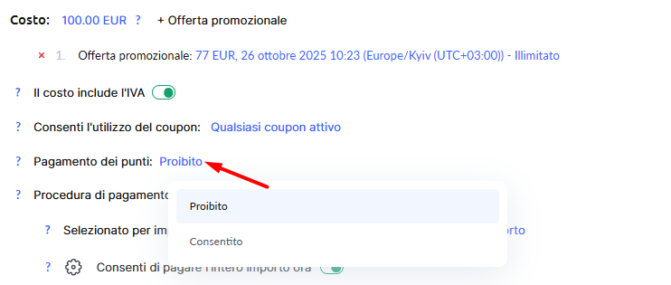 Pagamento con punti: se la tua scuola dispone di un programma fedeltà attivo, attiva questa opzione per permettere agli studenti di utilizzare i punti accumulati per pagare il corso.