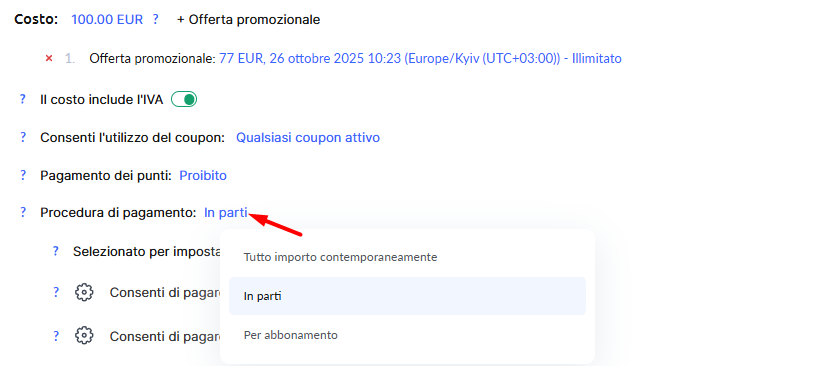 Durante la configurazione del pagamento a rate, puoi definire quale importo del primo pagamento verrà mostrato al cliente sulla pagina d’acquisto. Questo può contribuire a migliorare la conversione, poiché un prezzo iniziale più basso risulta più attraente per gli studenti.