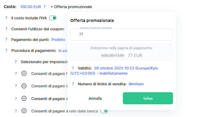 Periodo di validità dell’offerta: è il tempo durante il quale gli studenti possono pagare il piano. Non si tratta del periodo di accesso al corso, ma del tempo in cui la vendita è aperta. Normalmente si lascia come indefinito.