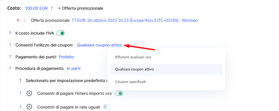Puoi anche vietare l’uso di qualsiasi coupon di sconto, consentire qualsiasi coupon attivo o limitarne l’uso a determinati coupon che creerai appositamente per questa offerta. Maggiori informazioni sui coupon sono disponibili in un articolo separato.