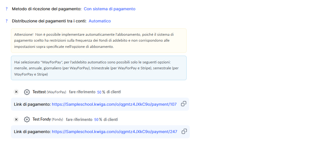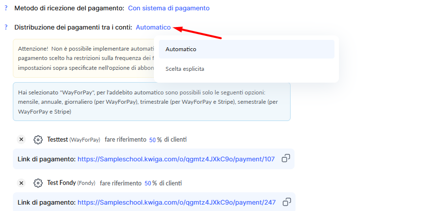 Se hai collegato più sistemi di pagamento (o più account all’interno dello stesso), puoi configurare la distribuzione automatica e impostare le percentuali di ripartizione tra di essi.