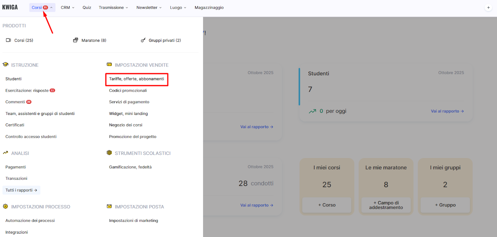 Apri il menu superiore Corsi e, nel blocco di configurazione delle vendite, seleziona Tariffe, offerte.