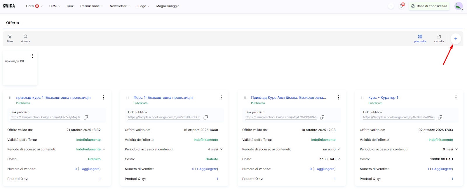 Nota: prima di creare un’offerta, assicurati che il corso sia già stato creato. Non è necessario che contenga materiali; è sufficiente che abbia una struttura di base.