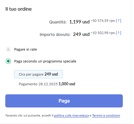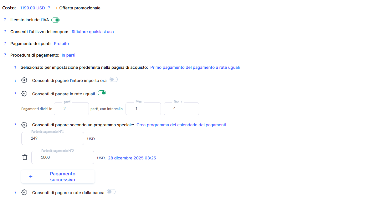Inoltre, nell’esempio è consentito il pagamento completo di 1199. Puoi permettere il pagamento immediato dell’intero importo e indicare un importo totale più elevato, ad esempio 249 + 1000, per incentivare chi preferisce pagare tutto subito.