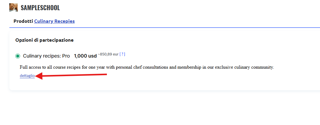 Se hai creato un’offerta promozionale con sconto, gli studenti vedranno il prezzo ridotto evidenziato in grassetto, con il prezzo precedente barrato accanto. Questo mette visivamente in risalto il vantaggio di effettuare l’acquisto in questo momento.