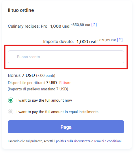 Se hai creato coupon di sconto e ne hai consentito l’uso per questa offerta, nella pagina apparirà un campo speciale per il codice promozionale.