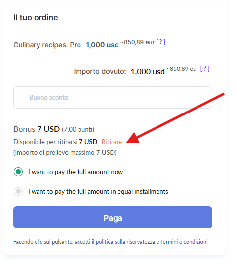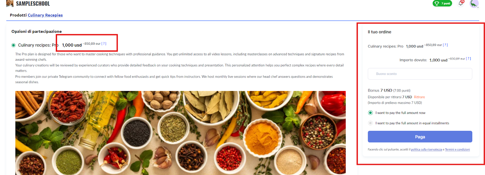 Quando l’opzione di pagamento con punti è abilitata, gli studenti vedranno la possibilità di utilizzare i punti bonus accumulati per ridurre il costo del loro acquisto.