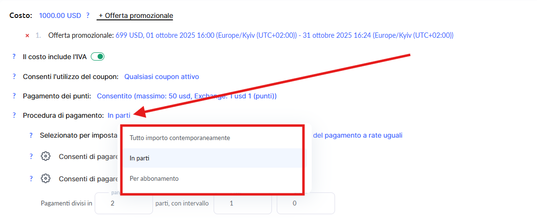 Durante la configurazione dei pagamenti rateali, puoi specificare quale importo il cliente vedrà come primo pagamento nella pagina di acquisto.