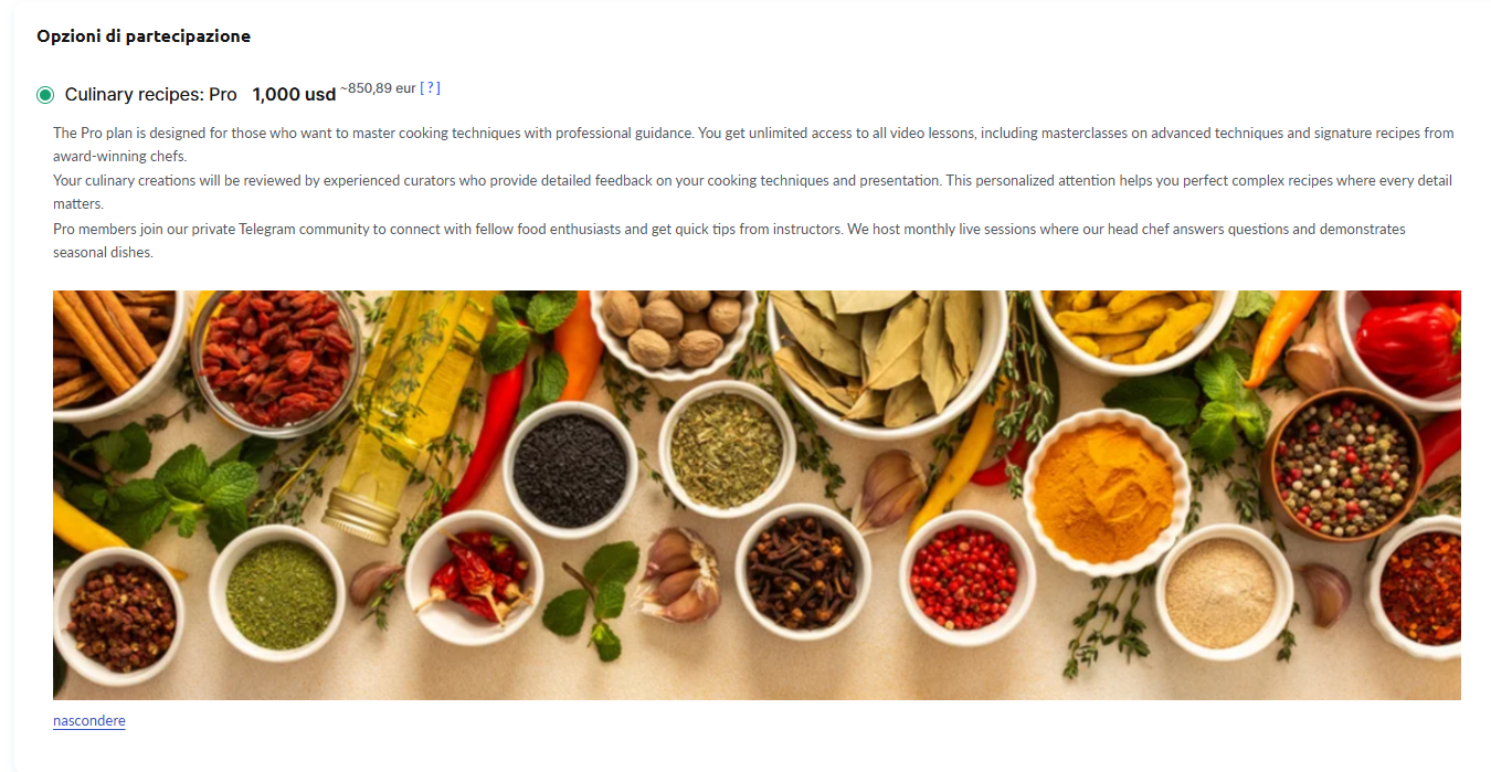 Questa è la prima cosa che un potenziale studente vede, quindi è consigliabile descrivere in modo conciso i principali vantaggi dell’offerta.