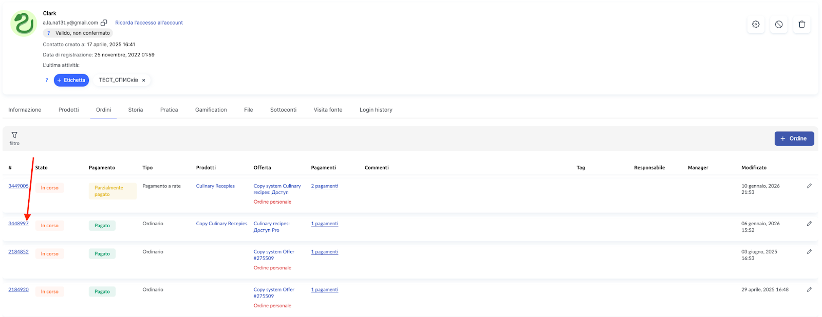 Puoi visualizzare l'ordine di un cliente andando nella sua scheda di contatto e aprendo la scheda "Ordini".