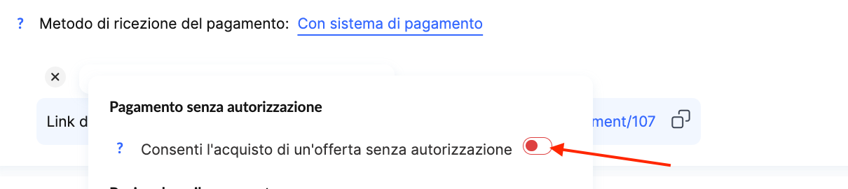 Nelle impostazioni dell’offerta, assicurati che nella sezione “Metodo di pagamento” sia selezionata l’opzione “Tramite sistema di pagamento”.