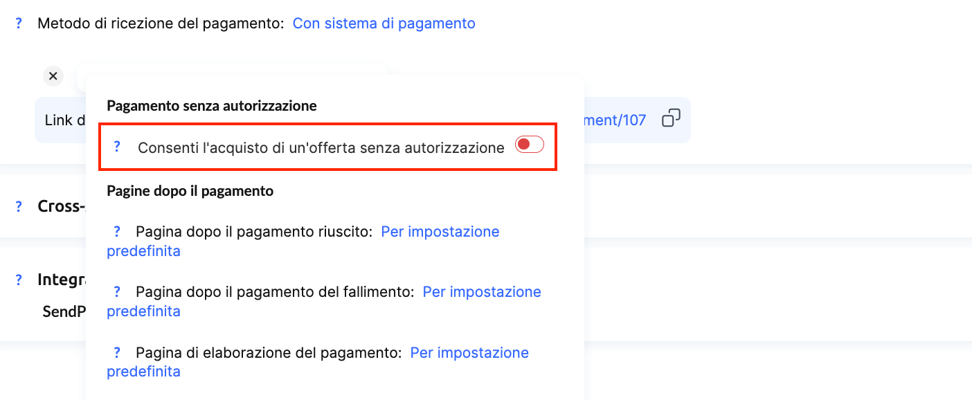 Le impostazioni dell’offerta consentono ai clienti di effettuare pagamenti senza autorizzazione. Ciò significa che il cliente paga prima e solo successivamente può accedere.