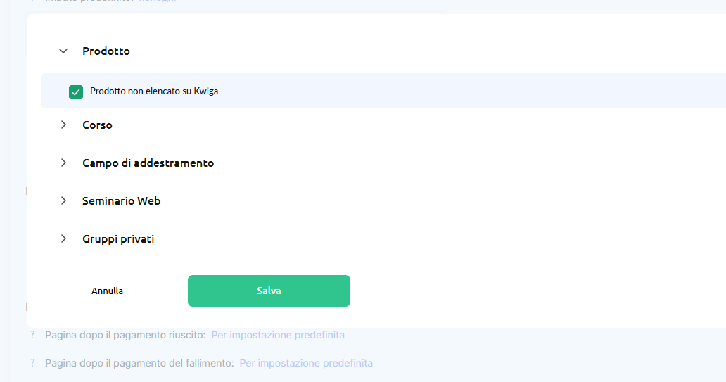 Poiché in questo caso non stai vendendo l’accesso a un prodotto all’interno di Kwiga, devi scegliere “Prodotto – Prodotto esterno”.