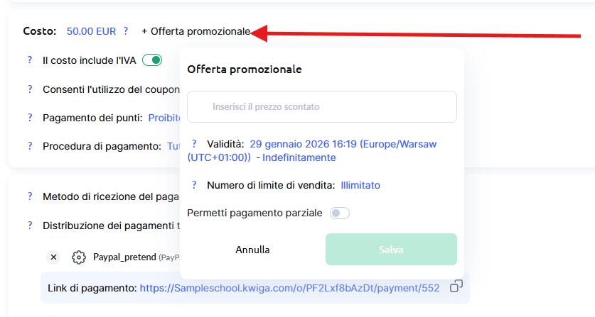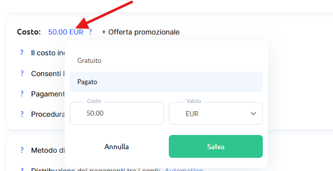 Seleziona “A pagamento” e si apriranno immediatamente ulteriori impostazioni per specificare il prezzo e la valuta. Qui indica il prezzo base del corso, e successivamente potrai aggiungere offerte promozionali.