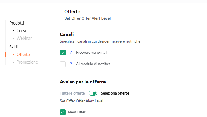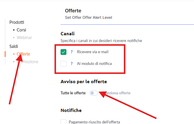 Puoi configurare le notifiche per tutte le vendite oppure per offerte specifiche. Le consulenze richiedono attenzione personale e partecipazione diretta, quindi è importante non perdere nessun pagamento relativo ad esse. Per configurare queste notifiche: