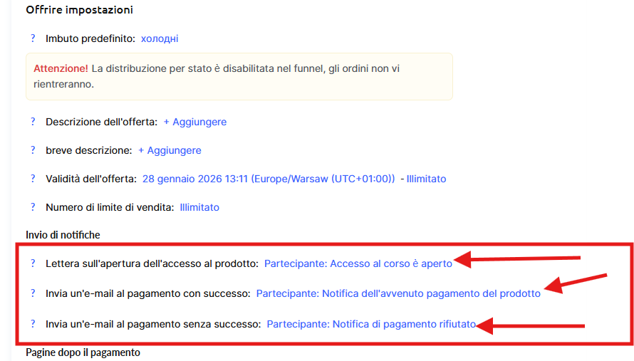 Qui puoi configurare quali email riceveranno i clienti nel caso in cui il pagamento vada a buon fine o non vada a buon fine.