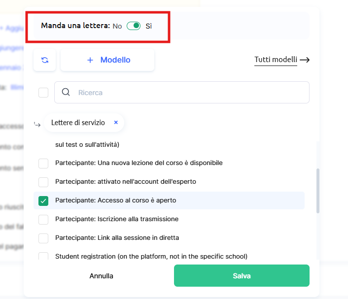 Per selezionare un modello diverso per l’invio delle email dopo un pagamento riuscito (o non riuscito), assicurati che l’interruttore in alto consenta l’invio delle email e scegli il modello desiderato.