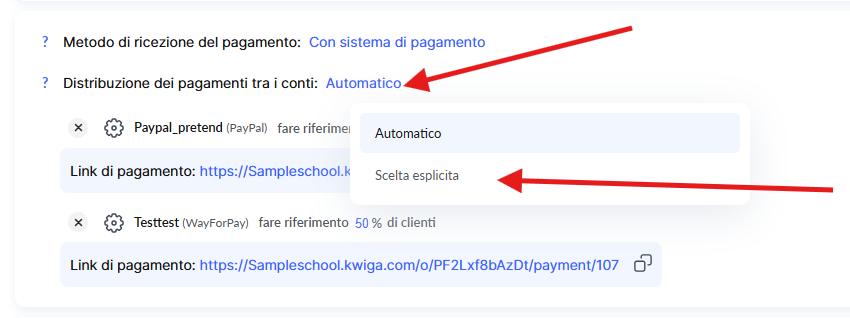 Se hai collegato più di un sistema di pagamento (o più account all’interno di uno stesso sistema), puoi configurare l’accettazione automatica dei pagamenti e specificare la percentuale di distribuzione.