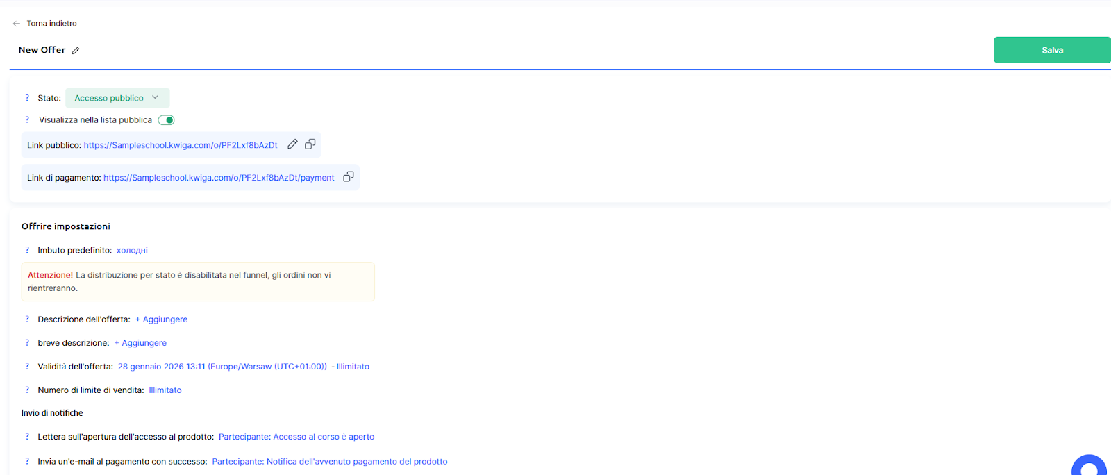 Scegli il sistema di pagamento che desideri utilizzare per ricevere i pagamenti per questa offerta. Tieni presente che Kwiga non è un sistema di pagamento e, se vuoi accettare pagamenti sulla piattaforma affinché gli studenti ottengano automaticamente l’accesso al corso, devi collegare un sistema di pagamento (consulta le istruzioni nell’articolo “Come integrare un sistema di pagamento in Kwiga”).