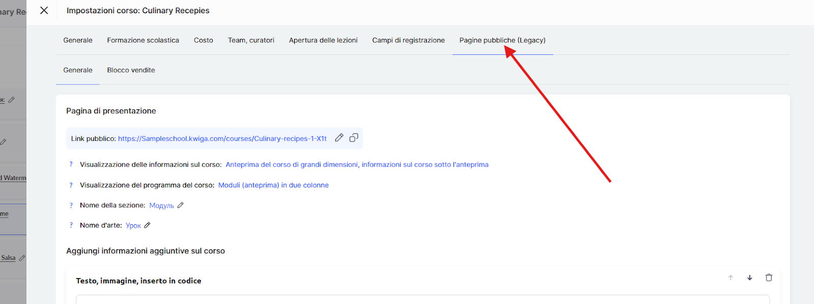 Apri la pagina del corso o della lezione in cui desideri inserire il link alla consulenza.