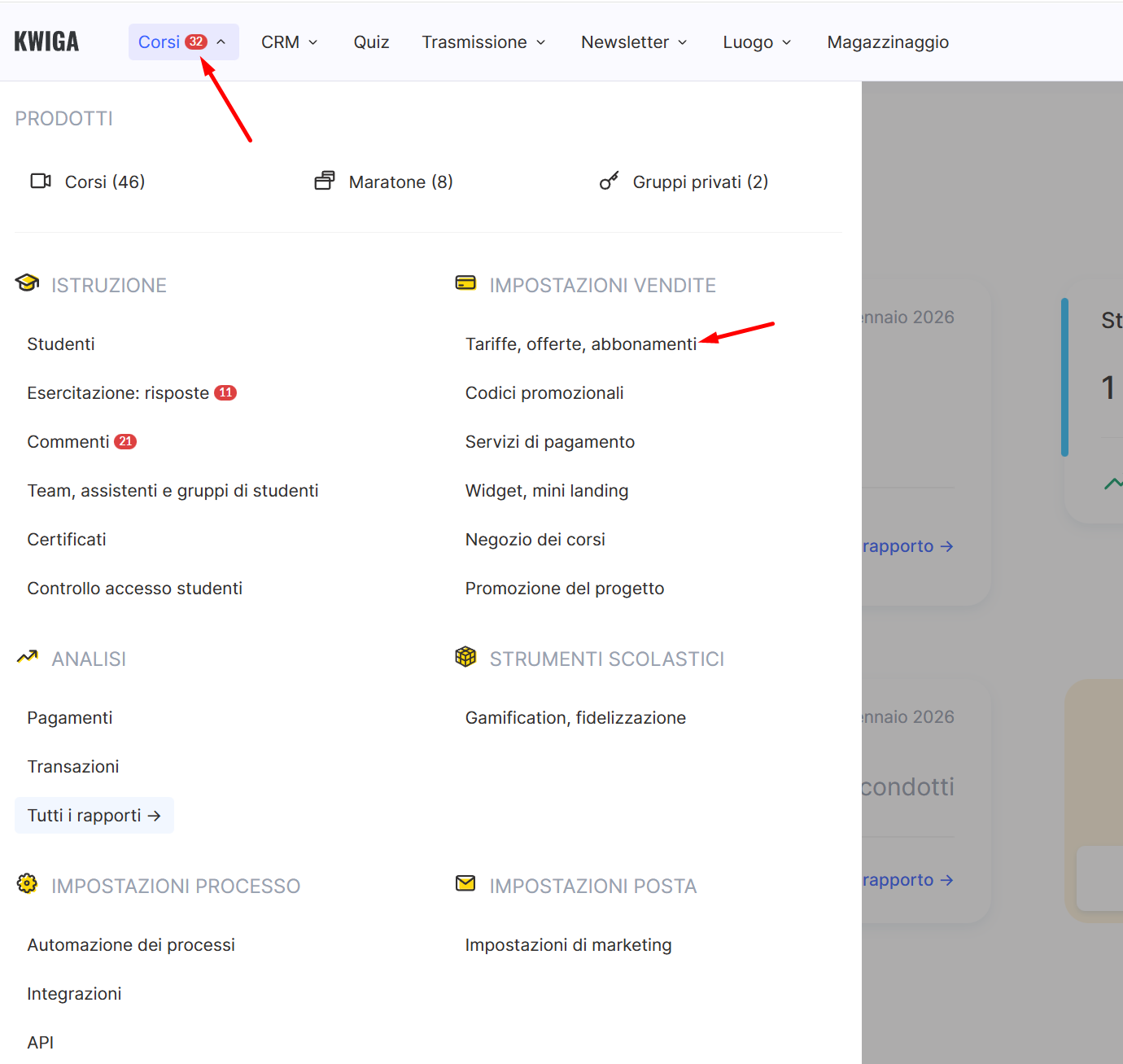 Dopo aver creato e pubblicato il corso, vai al menu Corsi nella parte superiore della piattaforma e seleziona Tariffe, Offerte.