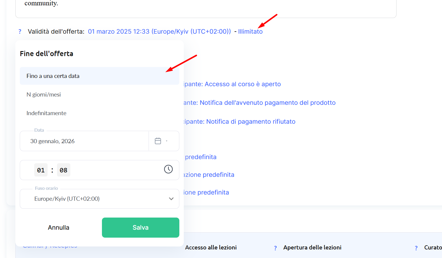 Se desideri limitare il periodo durante il quale gli studenti possono registrarsi per l’accesso demo al corso, apri le Impostazioni dell’offerta e imposta le date desiderate nel campo Periodo di validità dell’offerta.