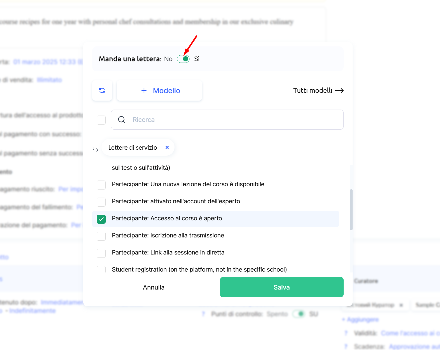 Fai clic sul nome del modello (ad esempio Partecipante: Notifica di accesso al prodotto) e seleziona il nuovo modello dall’elenco. Non dimenticare di salvare le modifiche.