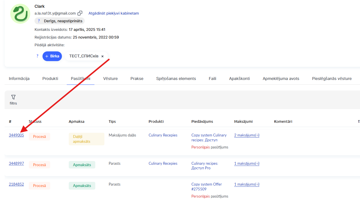 Lai atzīmētu kādu no maksājumiem, kas veikti caur platformu, kā apmaksātu, dodieties uz Contacts, atrodiet attiecīgo klientu (studentu), atveriet viņa kontaktkartīti un pārejiet uz cilni Orders. Noklikšķiniet uz pasūtījuma numura.
