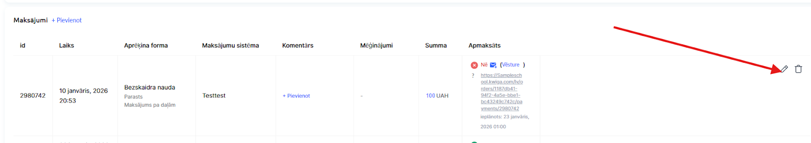 Ritiniet atvērto lapu uz leju līdz sadaļai Payments. Blakus maksājumiem, kas atzīmēti kā neapmaksāti, redzēsiet ikonu zīmuļa formā; noklikšķiniet uz tās, lai rediģētu maksājumu.